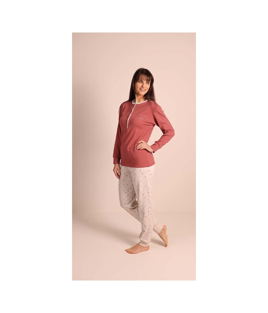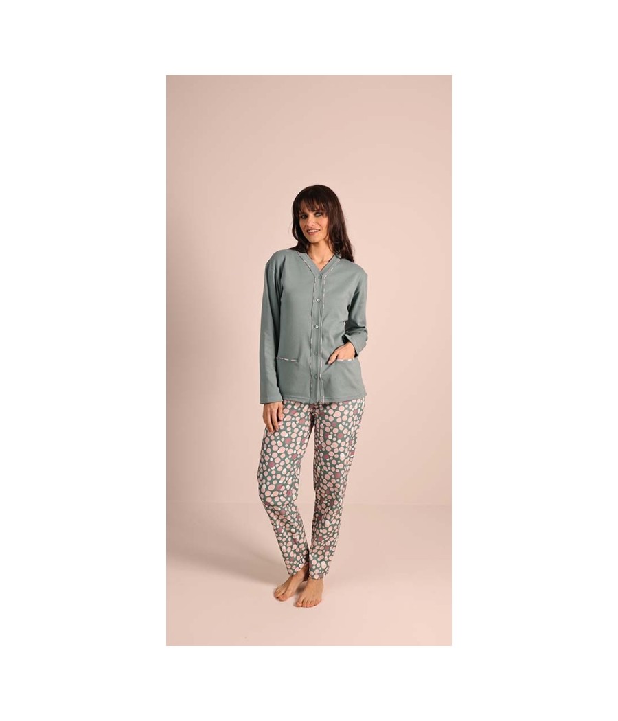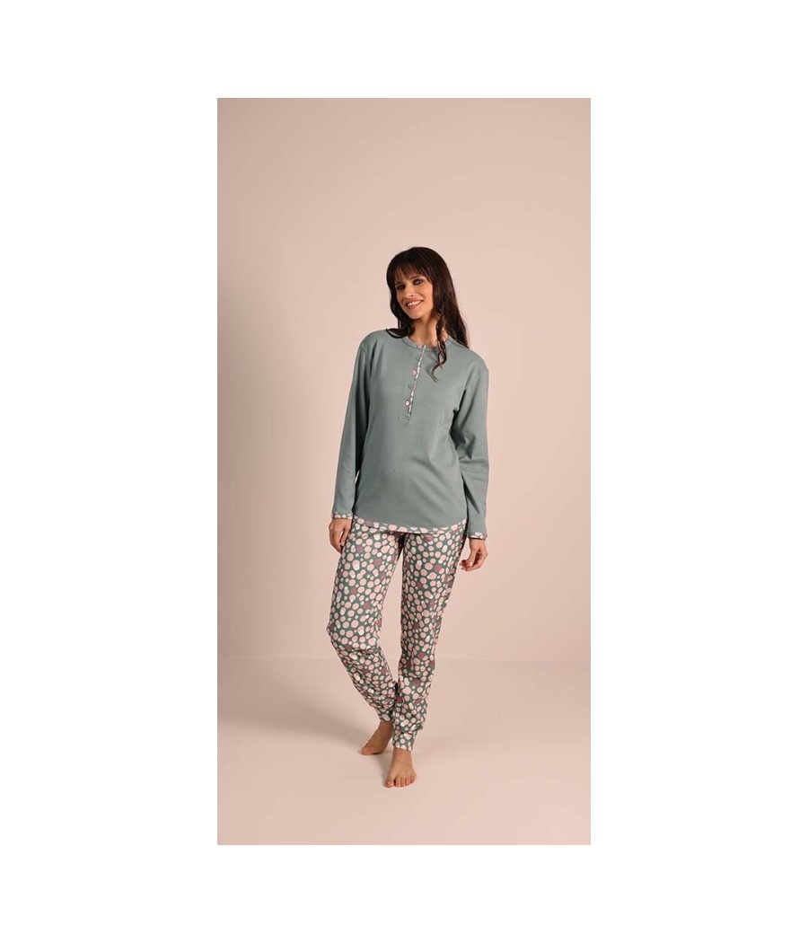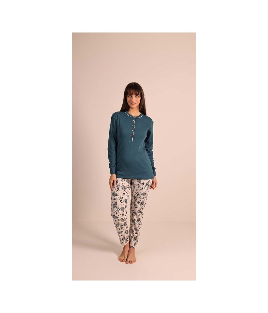Pigiama donna Gary modello 5050 in 100% caldo cotone interlock. Maglia tinta unita con collo Serafino e pantalone fantasia coordinato. Caldo, morbido e confortevole, ideale per la stagione invernale. Disponibile nelle taglie dalla S alla XL e nei colori ottanio e tortora.