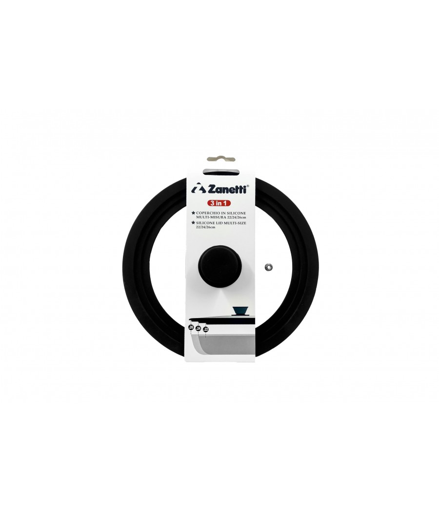 Coperchio universale Zanetti 3 in 1 adatto a padelle e casseruole da 28, 30 e 32 cm. Realizzato in vetro temperato con bordo in silicone e pomello antiscottatura. Garantisce una chiusura ermetica, riduce la dispersione di calore e accelera i tempi di cottura.