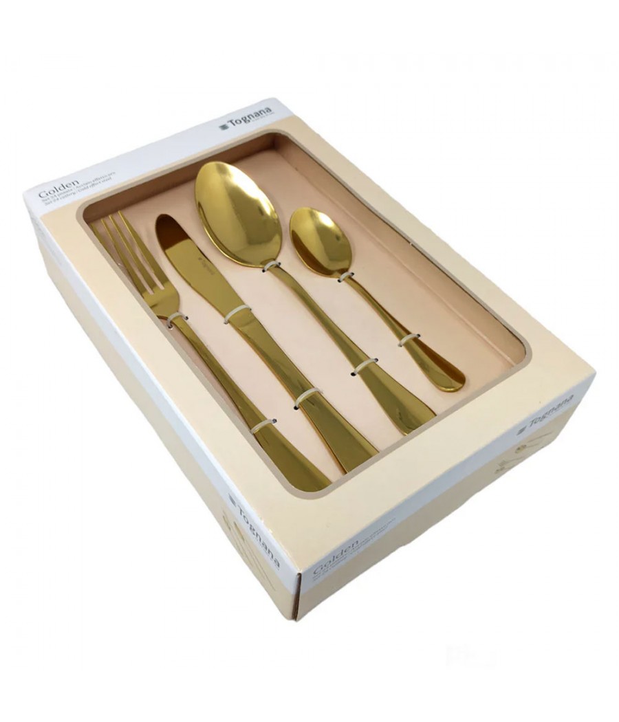Set di 24 posate Tognana in acciaio inox con finitura color oro, elegante e raffinato. Include 6 forchette, 6 coltelli, 6 cucchiai grandi e 6 cucchiaini, perfetto per una tavola moderna e di classe.