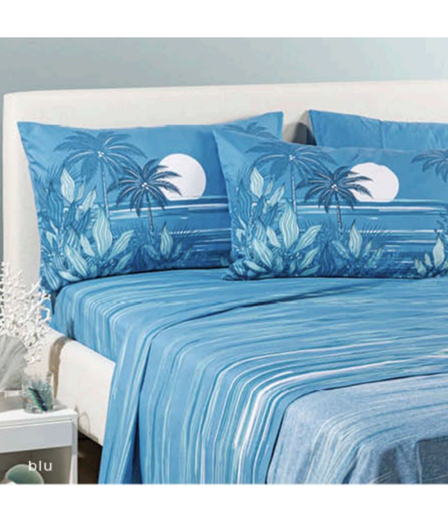 Completo lenzuola matrimoniale 2 posti Palm Spring Caleffi in 100% cotone con stampa digitale ad alta definizione. Set completo con lenzuolo sotto con angoli, lenzuolo sopra e 2 federe coordinate. Made in Italy.