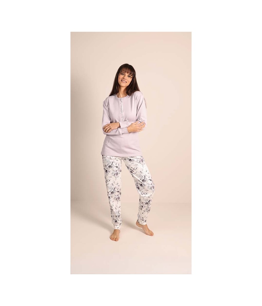 Pigiama donna Gary modello 5021 in 100% caldo cotone interlock. Maglia fantasia e pantalone tinta unita con bordo in costina. Caldo, morbido e confortevole, ideale per la stagione invernale. Disponibile nelle taglie dalla S alla XL e nei colori iris e polvere.