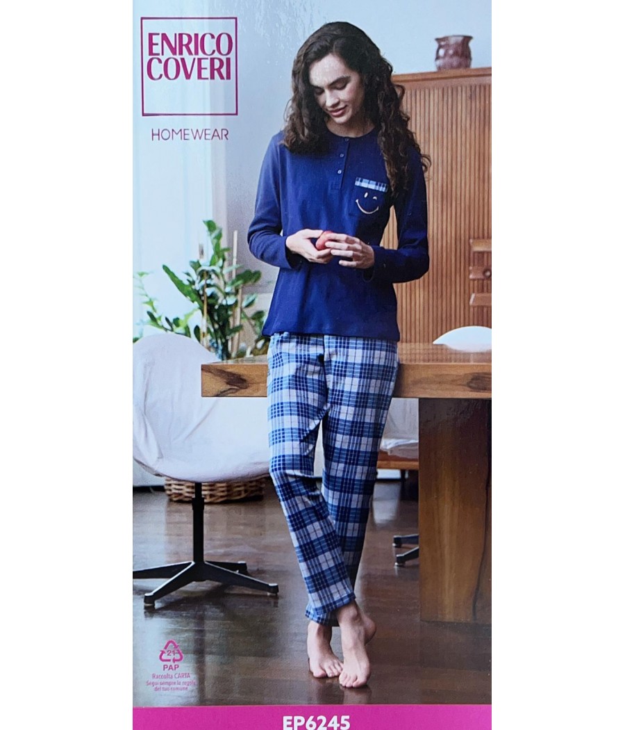 Pigiama donna Coveri modello EP6245 in 100% caldo cotone interlock, con maglia collo Serafino e pantalone coordinato. Caldo, morbido e traspirante, ideale per la stagione invernale. Disponibile nelle taglie dalla S alla XL e nei colori blu e lavanda.