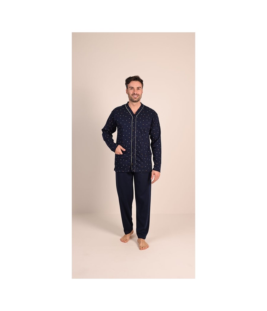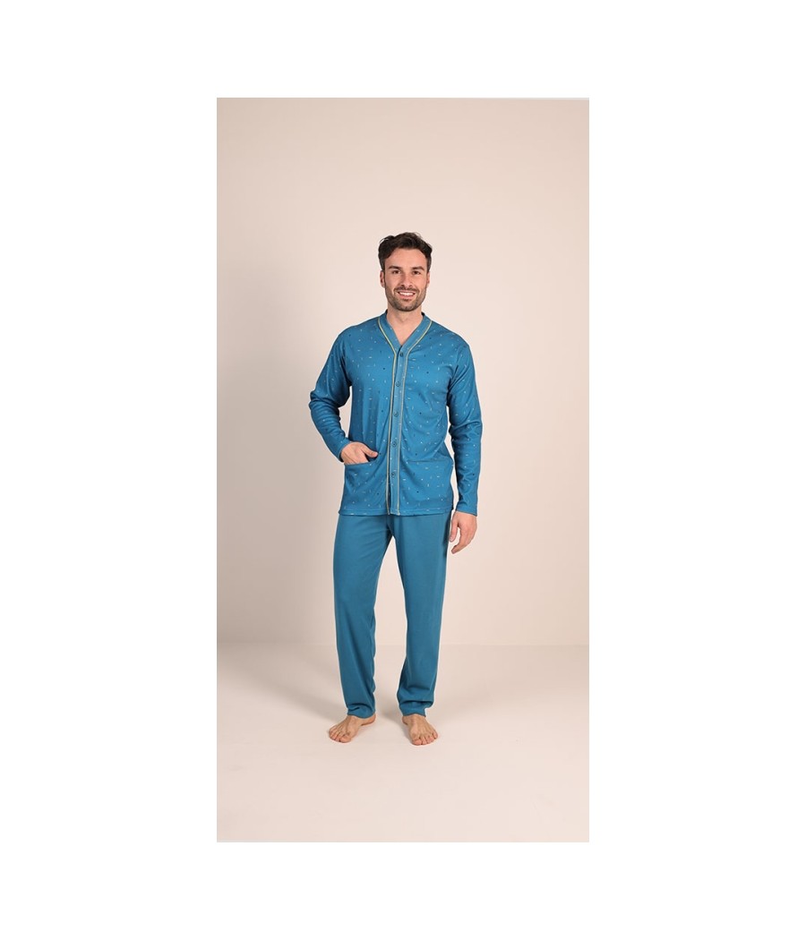 Pigiama uomo Gary modello 6022, realizzato in 100% caldo cotone interlock. Design con cardigan a fantasia dotato di tasche e pantalone tinta unita. Morbido, caldo e confortevole, ideale per la stagione invernale. Disponibile nelle taglie dalla M alla XXL e nei colori blu e cobalto.