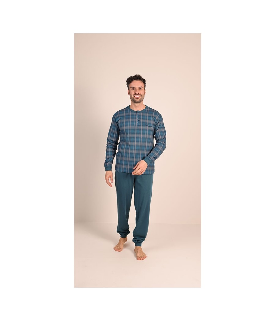 Pigiama uomo Gary modello 6041 in 100% caldo cotone interlock. Maglia fantasia con taschino e pantalone tinta unita con bordo in costina. Taglie calibrate dalla 56 alla 60, disponibile nei colori blu e verde inverno. Prodotto Made in Italy.