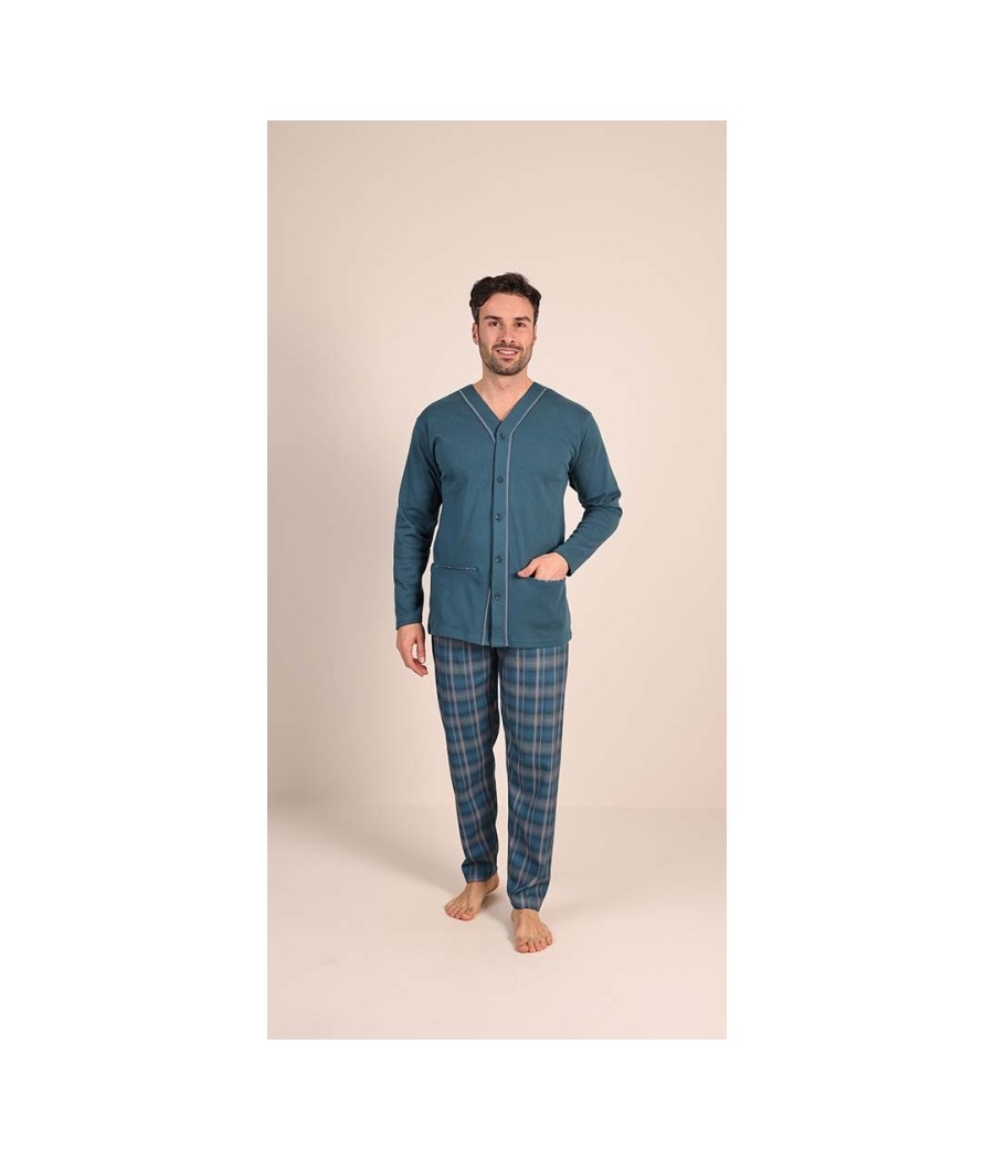 Pigiama uomo Gary modello 6042, realizzato in 100% caldo cotone interlock. Cardigan tinta unita con tasche frontali e pantalone fantasia. Morbido, caldo e confortevole, perfetto per la stagione invernale. Disponibile nelle taglie dalla M alla XXL e nei colori avio e verde inverno. Made in Italy.