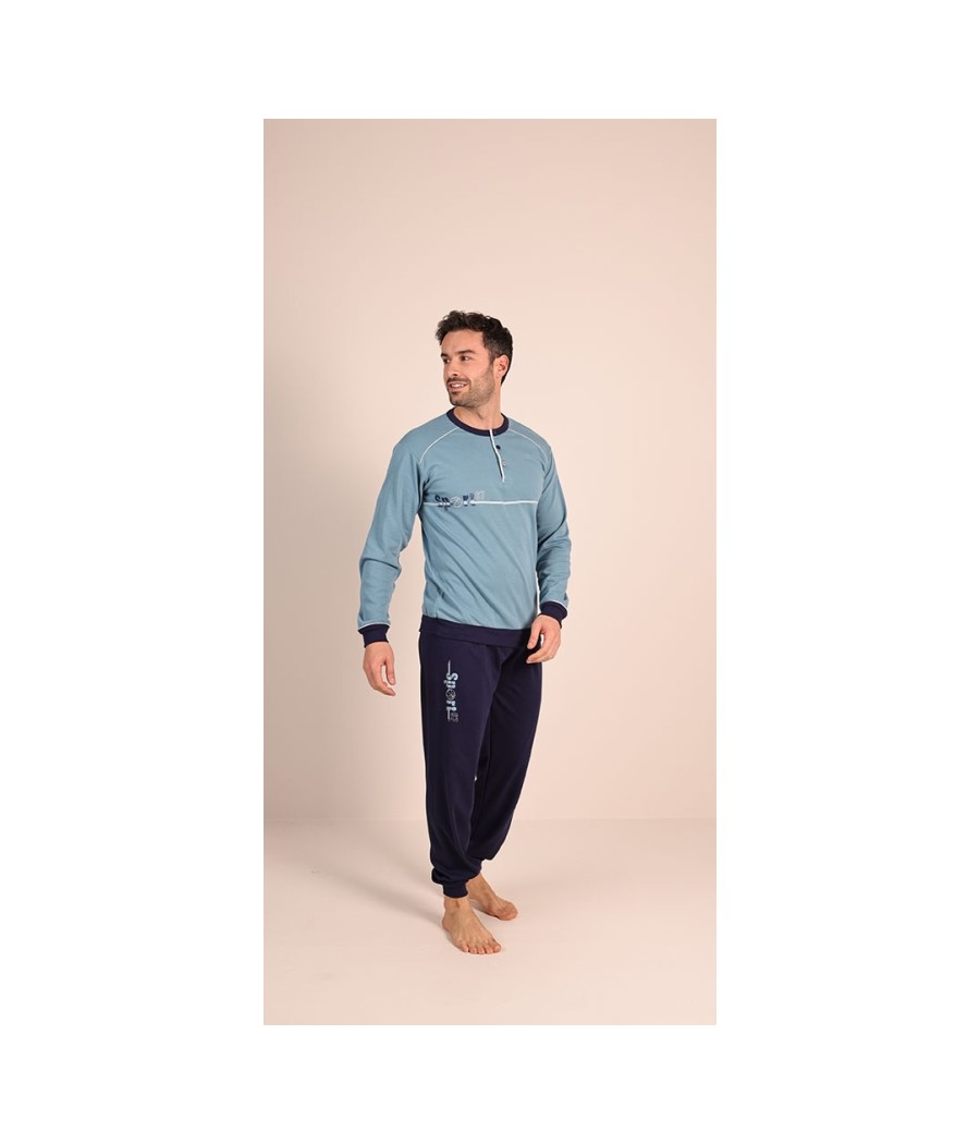 Pigiama uomo Gary modello 6051, realizzato in 100% caldo cotone interlock. Maglia tinta unita con stampa e pantalone tinta unita coordinato con stampa e bordo in costina. Morbido, caldo e confortevole, ideale per la stagione invernale. Disponibile nelle taglie dalla M alla XXL e nei colori bordeaux e azzurro chiaro. Made in Italy.