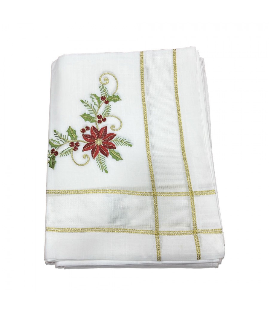 Servizio tavola ricamato per 12 posti con misura maxi 180x270 cm, completo di 12 tovaglioli, perfetto per portare l’atmosfera natalizia sulla tua tavola.