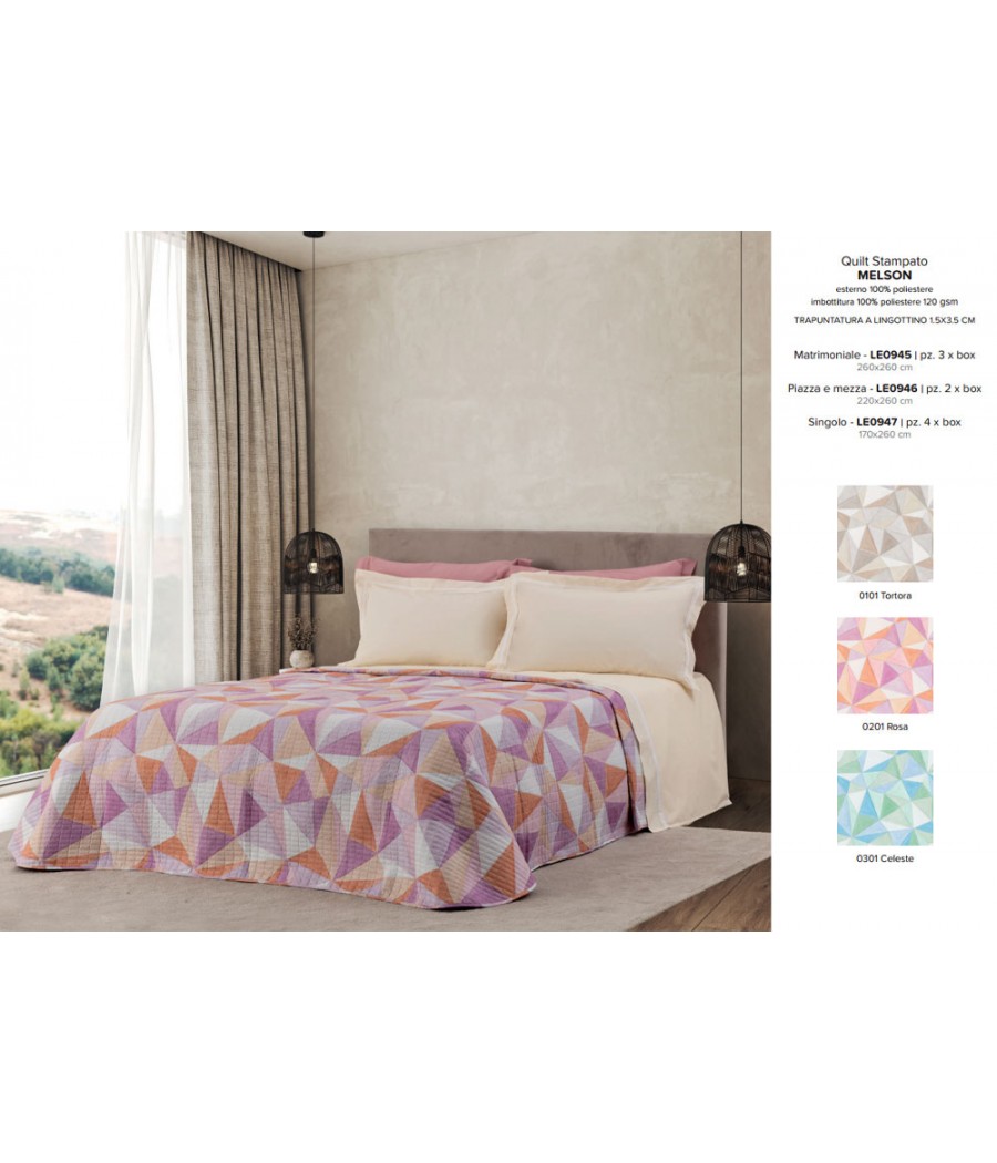 Il Trapuntino singolo Linea Oro MELSON è un quilt leggero con imbottitura 120 gr/m², ideale per le mezze stagioni. Fantasia stampata e finitura con trapuntatura a lingottino. Misura 170x260 cm. Disponibile in diversi colori.