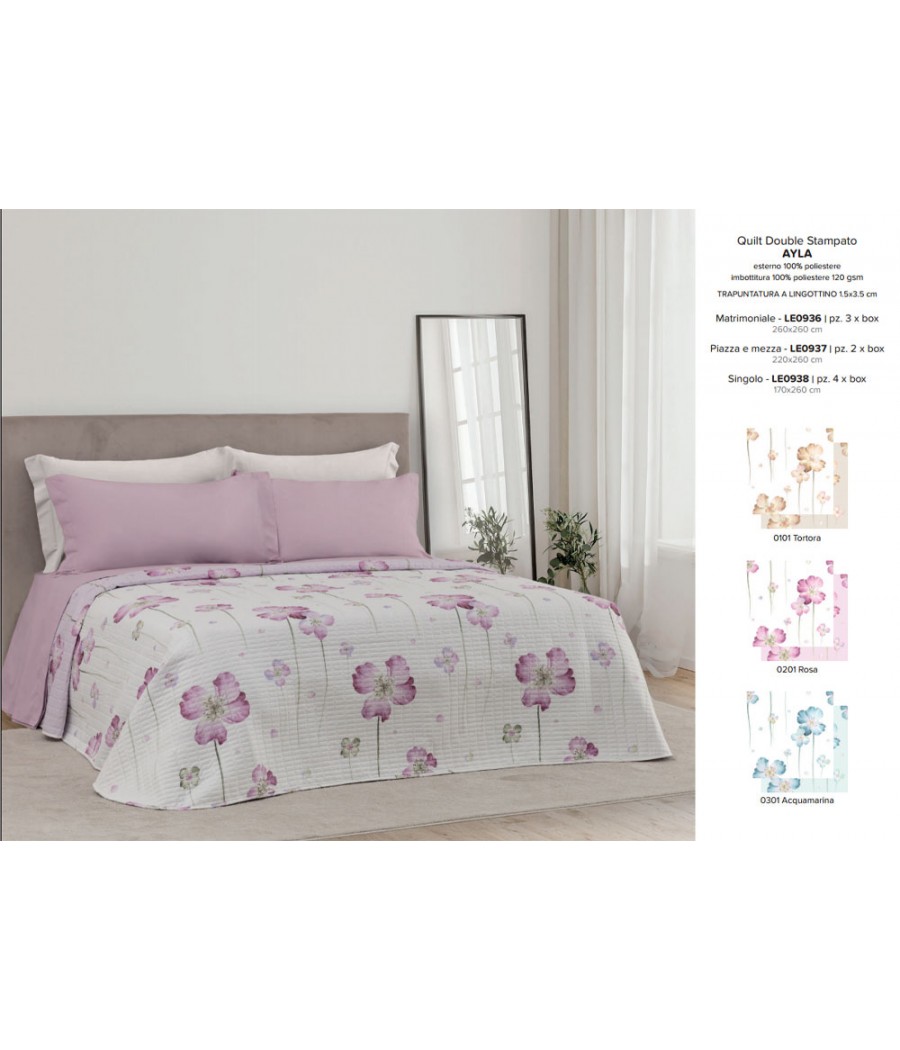Il Trapuntino matrimoniale Linea Oro AYLA è un quilt leggero con imbottitura 120 gr/m², ideale per le mezze stagioni. Fantasia double stampata e finitura con trapuntatura a lingottino. Misura 260x260 cm. Disponibile in diversi colori.