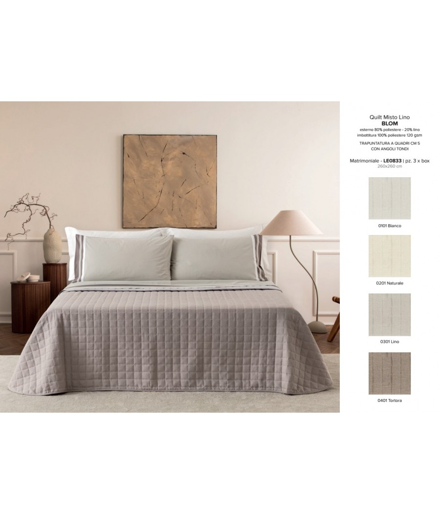 Il trapuntino matrimoniale Linea Oro Blom in misto lino è la soluzione ideale per chi desidera vestire il letto con stile, eleganza e semplicità. Con la sua misura 260x260 cm, è perfetto per letti matrimoniali e dona alla camera un aspetto raffinato e accogliente. Realizzato con esterno 80% poliestere e 20% lino, è disponibile in diversi colori moderni e naturali.